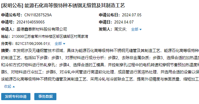 2024年7月5日,盛德鑫泰新材料股份有限公司成功申請一項名為“能源石化高等級特種不銹鋼無縫管及其制造工藝”專利,申請公布CN118287529A,申請日期為2024年4月7日。
